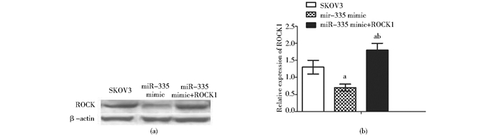 | 图 7 转染miR-335、ROCK1对SKOV3中ROCK1蛋白表达的调控作用 Fig. 7 The effect of transfection miR-335 and ROCK1 on ROCK1 protein expression in SKOV3 Mean±SD, n=3, a:P<0.05, vs SKOV3 group(negative control), b:P<0.05, vs miR-335 mimic group |