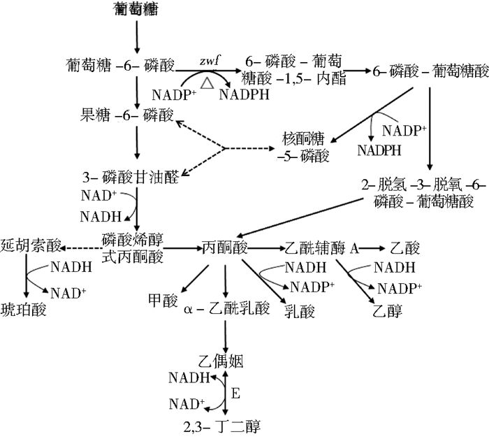 本研究首次尝试通过Cre/lox体系[15]弱化PPP中的关键酶G6PDH的基因zwf,使碳代谢更多地流向EMP途径,来增强胞内的NADH水平(图 1),提高2,3-BD的产量。为了进一步提高2,3-BD的生产能力,降低乙酸、乳酸等有机酸的积累量,后期研究了几个不同来源的ACR基因在B.subtilis168中的克隆表达情况,结果发现,来源于克雷伯氏菌ACR的相对酶活力最高,将此来源的ACR基因kphs导入到已成功构建的重组弱化菌株B.subtilis168△zwf中加强表达,通过同时增强胞内辅酶NDAH水平和ACR酶活力的双重效应提高2,3-BD产量和生产效率。