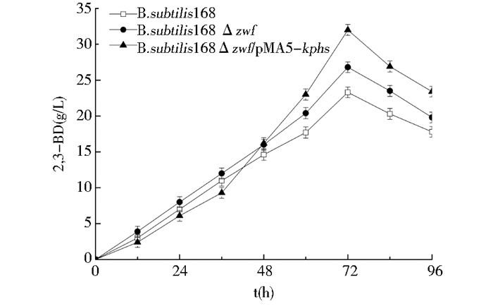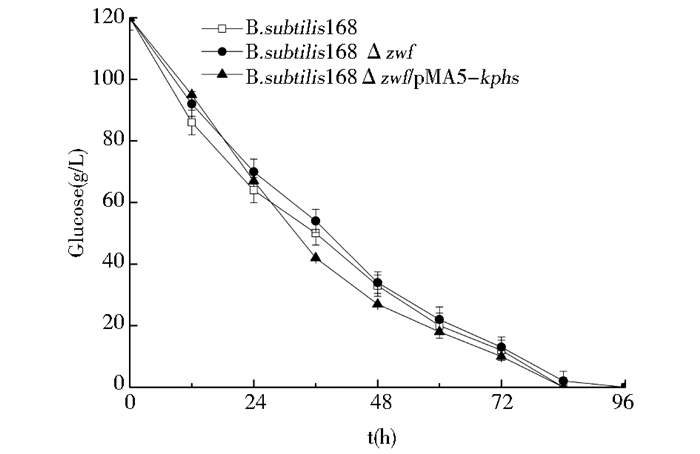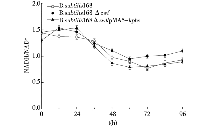 2.3.1 2,3-BD高产菌株生长和胞内辅因子水平分析从图 6可知,重组菌株B. subtilis168△zwf/pMA5-kphs与出发菌B. subtilis168相比生长量有所下降,可能是因为外源质粒的导入导致ACR过量表达,加重了菌体生长的负担,生长受到抑制。由图 7可知,在菌体生长前期(0~24h),糖耗速率较之出发菌株,重组菌株B. subtilis168△zwf/pMA5-kphs利用葡萄糖的速率稍低;菌体生长的后期(24 h~72 h),重组菌B. subtilis168△zwf/pMA5-kphs利用葡萄糖的速率显著提高,当后期菌体开始大量合成2,3-BD后,细胞对碳源的需求大大增加,加速了葡萄糖的消耗,使得糖耗速率显著提高。从图 8可知,前期重组菌株B. subtilis168△zwf/pMA5-kphs NADH水平与出发菌相比略有提高,但后期重组菌株B. subtilis168△zwf/pMA5-kphs NADH水平有所下降,由于弱化了PPP途径的关键酶G6PDH基因zwf,代谢更多地流向EMP途径,使得前期NADH水平有所提高,而后期过量表达的ACR促进了AC向2,3-BD的转化,NADH参与合成2,3-BD而被大量消耗。