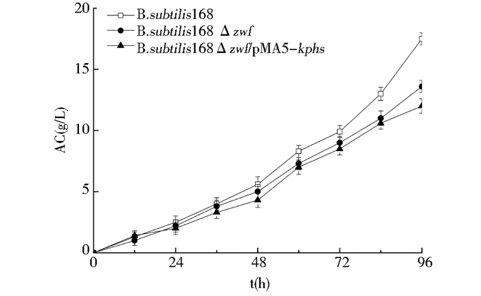 1.8 重组枯草芽孢杆菌2,3-BD的摇瓶发酵重组菌株B.subtilis168△zwf,B.subtilis168△zwf/pMA5-kphs和出发菌株B. subtilis 168,经过LB液体培养基活化12 h后,按照4%的接种量转接至发酵培养基中,发酵的初始pH 6.5。发酵过程中定期取样监测菌体生长、葡萄糖含量、2,3-BD、AC和相关有机酸的含量,底物耗尽后结束发酵。