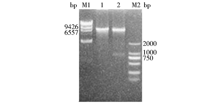 | 图 5 重组质粒pMA5-kphs的酶切验证 Fig. 5 Identification of the recombinant plasmid pMA5-kphs by enzyme digestion 1: pMA5-kphs/BamH I; 2: pMA5- kphs/BamH I+Mlu I;M1: λ-Hind Ⅲ marker; M2: DL 2000 marker |