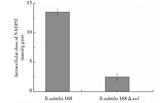 | 图 9 原始菌与PPP途径弱化后胞内NADPH比较 Fig. 9 Intracellular NADPH concentrations in B. subtilis 168 and B. subtilis168△zwf |