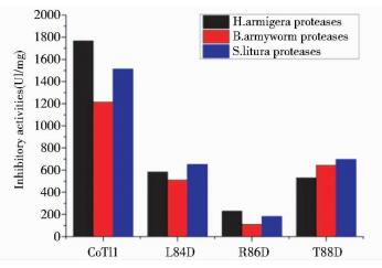| 图 6 突变体CoTI1R86D、CoTI1L84D、CoTI1T88D对3种虫子肠道蛋白酶液的抑制活性 Figure 6 Inhibition essay of CoTI1R86D, CoTI1L84D, CoTI1T88D to proteases of three insects |