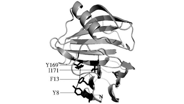 以Penicillium funiculosum(PDB:1TE1)、E. coli (2VUL)和Hypocrea jecorina(1ENX)木聚糖酶晶体结构为模板,对AoXyn11A三维结构进行了多模板同源建模。突变前后酶三维结构中疏水相互作用的分析表明,AoXyn11A和AoXyn11AY13F的疏水作用力数目无变化,其中第13位的Y或F分别与Y8、Y169和I171形成疏水相互作用(图 2)。由于F较Y有更强的疏水性,因此F13与3个氨基酸形成更强的疏水相互作用,使酶的三维结构尤其是N端区域更加稳定,从而提高了酶的热稳定性。蛋白质/酶的N或C端是影响其热稳定性的重要区域,当发生热变性时,该区域首先去折叠导致蛋白质构象的破坏[17]。