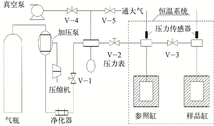 目前对于页岩气的等温吸附实验主要沿用煤层气的等温吸附实验方法,实验原理是:在一定的温度下,测定待吸附气体的压力和体积,利用理想气体状态方程计算气体的量,然后使吸附气体与吸附剂接触,使其达到吸附平衡后,再测定该气体的压力和体积,并利用理想气体状态方程计算吸附剩余气体的量,两次测定的气体的量之差即为吸附量。吸附气体多采用纯度大于99.99%的甲烷气体,岩样为干燥样,实验设备如图 1所示。该设备测试压力范围为0~30MPa,精度为0.001MPa;测试温度范围为0~120℃,精度为±0.1℃。