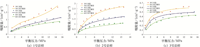 BET模型与实验数据拟合结果如图 3、表 5所示,9组实验数据的平均拟合误差为7.17%。同样,在平衡压力较低时,实验数据与模型难以拟合,与Langmuir模型相比,拟合效果略差一些。