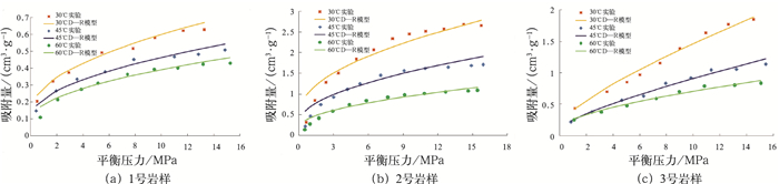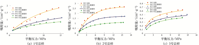 图 2 岩样实验数据与Langmuir模型拟合结果 |