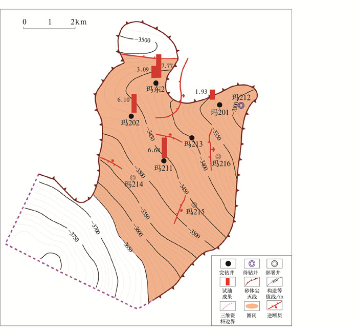 根据项目研究成果,从优质储层厚度的角度,选择水平井井口位于玛213井西北700m、玛东2井东南1800m的优质储层较厚处(图 5)。