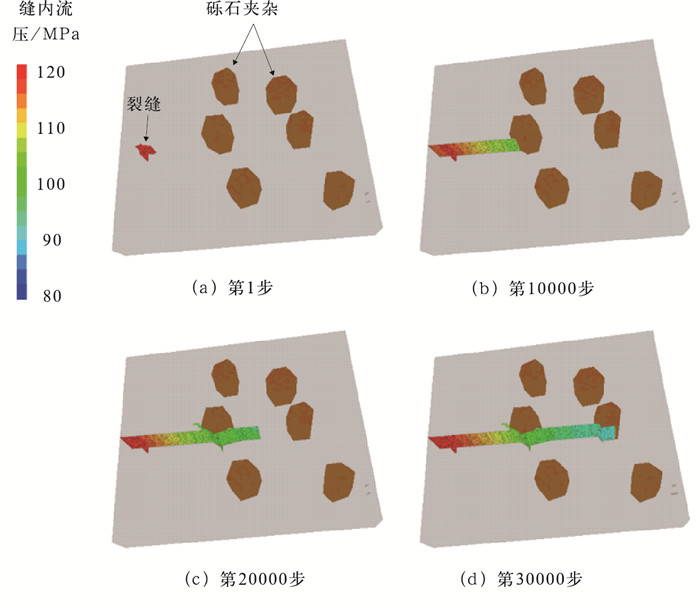 调研还发现,现有实验研究因为试样数量有限,结果随机分散性较大;而数值模拟研究主要采用有限元方法模拟岩体裂纹的扩展,针对裂缝形态的改变作定性的探讨,而对于工程中最关键的问题,即给定工艺后压裂效果受影响的程度仅作了逻辑上的推导。为评价压裂效果,需要进行流固耦合的模拟才能较好描述裂缝内压力衰减、扩展终止的情况。新疆油田利用3DEC离散元软件建立了概念性的拟三维模型,并给定压力边界条件,对砂砾岩中的水力压裂裂缝扩展过程进行了流固耦合的数值模拟研究(图 10),验证了文献给出的上述定性结论,同时表明砾石的存在确实可导致压裂能量更快衰减,压裂液的流动受到更大阻力;砾石还使得储层岩体表现出更强的塑性,与前述现象吻合。以上因素最终使得采用相同工艺时,含砾储层的改造长度缩短,控制体积更低。