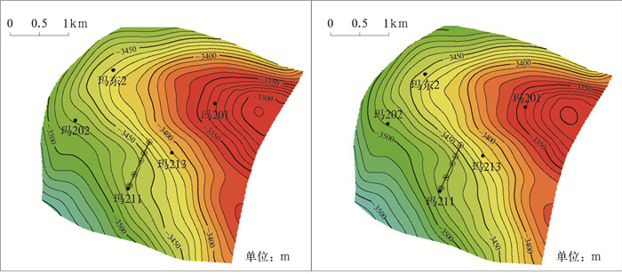 图 11 玛东2井区下乌尔禾组P2w43-1(左)顶界与(右)底界构造图 |