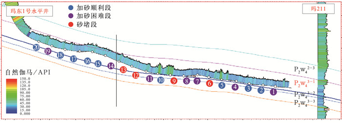 能否通过优选层位钻水平井和针对砂砾岩储层采取合理的压裂改造措施,使井区储量得到有效开发,是玛东2井区最关心的问题。新疆油田在深入研究井区及邻区资料和吸取文献地质工程一体化研究经验的基础上[24-26],开展了多学科一体化攻关,围绕砂砾岩储层的特点开展了地质研究和工程优化,着力提升单井品质,并于2015—2017年完钻、压裂并试采了井区的第一口水平开发试验评价井,对井区效益开发模式进行了进一步探索。