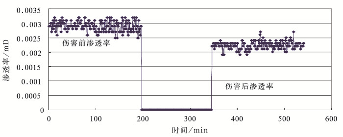 针对储层极强的水敏性,采用了防膨瓜尔胶压裂液体系,并通过试验验证达到设计要求。伤害实验采用压裂液破胶液驱替岩心,气测伤害前后的岩心渗透率,低浓度体系对岩心具有较低的伤害,平均伤害率为21.1%,满足对储层低伤害的要求(图 13);破乳实验采用井区原油,90℃下进行瓜尔胶破乳性能测试,结果表明与未加破乳助排剂的体系相比,具有明显的破乳效果,加入0.3%破乳助排剂,破乳率均达到95%以上。防膨实验表明,采用高效的有机黏土防膨剂,优选浓度为0.8%时,防膨率达到83.3%,性能良好。