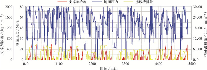 根据设计,累计用时13天完成20级、33簇压裂施工;入井总液量为18507.8m3,其中酸液99m3,滑溜水2957.5m3,冻胶15451.3m3;加砂1057m3,其中20~40目陶粒1022.9m3,40~70目陶粒34.1m3。携砂液排量为4.2~8.5m3/min,平均为6.5m3/min。平均砂比为17.1%;前置液比例平均为47.6%;瞬时停泵压力为35~53MPa,平均为39.7MPa;破裂压力为62~78MPa,平均为70MPa(图 14)。