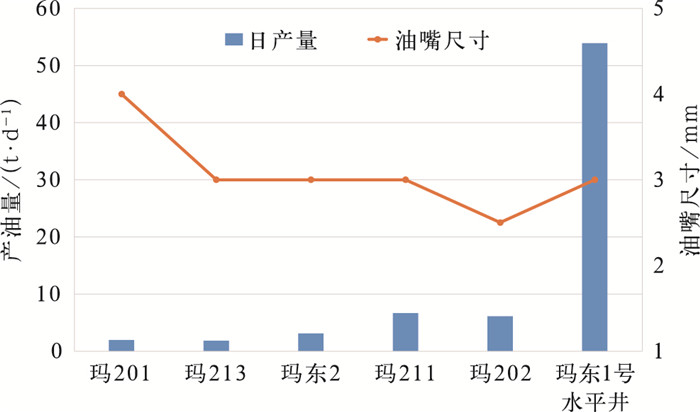 玛东1号水平井返排后,产油量逐渐上升,初期最大产油量为86.0t/d,产水量为5.49t/d;含水稳定后,采用3mm油嘴生产时,平均产油量为53.9t/d,产水量为2.42t/d;采用2.5mm油嘴生产时,平均产油量为38.13t/d,产水量为1.69t/d;压裂增产效果远远高于邻近直井(图 17)。