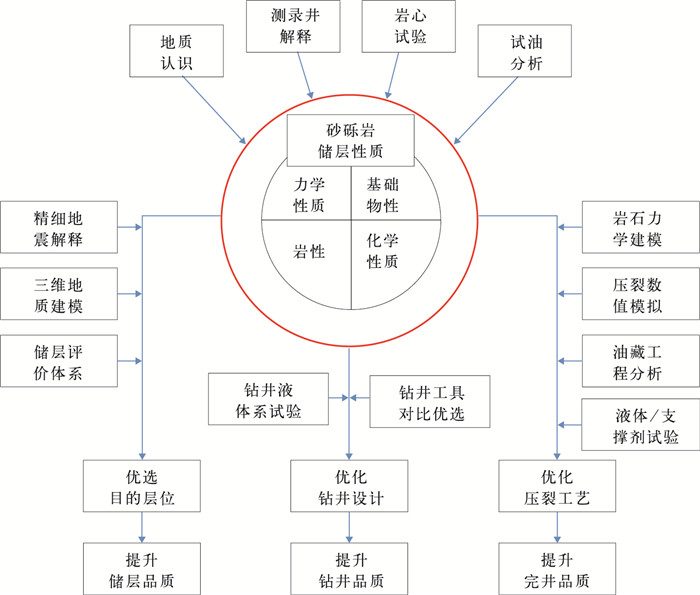 1 玛东地区下乌尔禾组储层特征玛东2井区位于新疆维吾尔自治区和布克赛尔县境内,区域构造位于准噶尔盆地陆梁隆起的夏盐凸起北部与三个泉凸起西部的结合部,主要目的层为二叠系下乌尔禾组。截至2015年,已完钻、压裂并试油了5口试验评价直井(图 1),探明含油面积17km2,控制储量上千万吨。为使得井区储量能得到有效动用,新疆油田利用地质工程一体化工作思路,对井区致密砂砾岩储层的特点和效益开发模式进行了研究(图 2)。