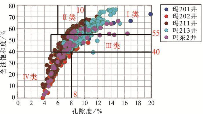1.3 储层评价标准及砾径的影响 1.3.1 储层评价初步标准根据测井资料计算了玛东2井区各评价直井的含油饱和度曲线和孔隙度曲线,并按惯例以含油饱和度和孔隙度为标准为储层定义了初步分类标准。将评价直井中各砂体层的平均值绘制成交会图后发现,数据点间并没有明显界限,因此根据经验将储层分为4类,其中Ⅰ—Ⅲ类为由好至差的油层,Ⅳ类为非油层(图 4)。根据三维地质建模结果,绘制油层厚度分布图(图 5),可见储层水平方向上的甜点在井区北部中间位置。