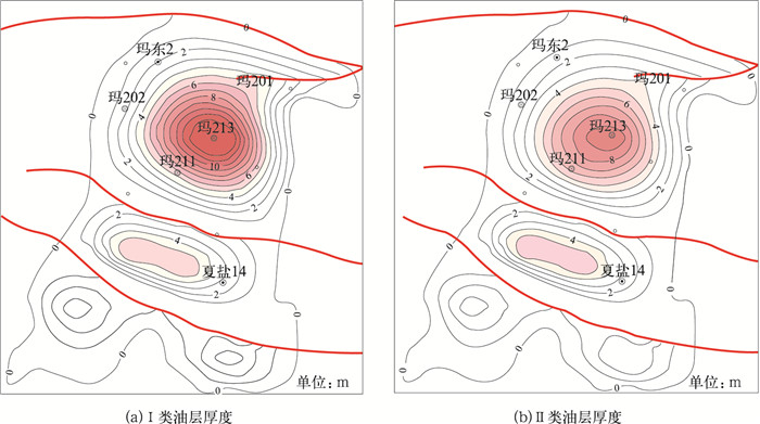 图 5 玛东2井区P2w4段Ⅰ、Ⅱ类油层厚度图 |