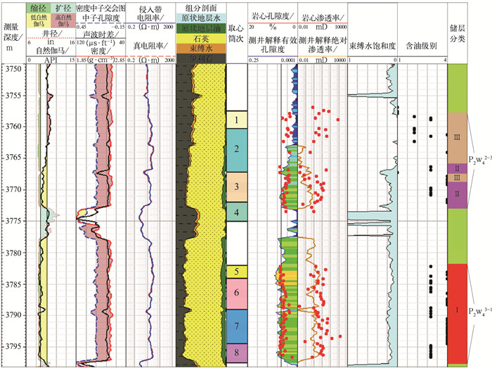 1.2.2 储层物性特征物性资料分析显示主要目的层段P2w4段储层孔隙度为2.6%~10.9%,平均为6.6%,渗透率为0.016~126.0mD,平均为3.68mD,属于特低孔、特低渗储层[27];油层孔隙度为6.5%~10.9%,平均为7.3%,渗透率为0.08~126.00mD,平均为4.12mD(图 3)。相比邻近的玛131井区百口泉组储层,玛东2井区P2w4段储层孔隙度更低(玛131井区孔隙度为9.6%),但渗透率略高(玛131井区渗透率为0.96mD)。铸体薄片鉴定结果统计显示,P2w4段储层储集空间以次生孔隙为主,主要孔隙类型有粒内溶孔(占37%)、界面孔(占30%)、粒间溶孔(占15%)、微裂缝(占9%)、基质溶孔(占5%)、粒间残留孔(占4%)。压汞资料显示玛东2井区P2w4段油层平均分选系数为1.58,平均变异系数为0.13,最大孔喉半径为1.98µm,孔喉体积比为2.16;平均中值压力为17.72MPa,平均中值半径为0.048μm,平均排驱压力为0.62MPa,平均毛细管半径为0.41μm。孔隙结构为中—低孔微细喉道,孔隙结构略差于邻近玛131井区。