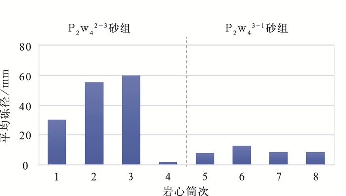 根据测井解释分析油层在纵向上的分布。P2w42砂组下部储层非均质性较强,自然伽马值和泥质含量由上至下逐渐降低,密度变化较大,储层以Ⅱ、Ⅲ类为主。而至P2w43砂组上部,自然伽马、密度、声波时差、电阻率曲线基本平直,变化不大;孔隙度与渗透率较高;储层以Ⅰ类为主(图 6)。从各筒次岩心的砾径统计可以看出,P2w43砂组的砾径较小(图 7),在该组砂岩中的钻进和改造也相对容易。因此,储层纵向上的地质甜点在P2w43组上部。