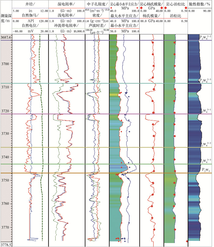 2.1 储层岩石力学参数 2.1.1 储层岩石力学性质依据声波测井曲线和岩心实验标定,分别计算各井泊松比、杨氏模量及脆性指数(表 2)。