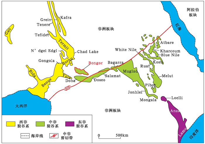 构造反转作为一个重要的构造事件深刻影响沉积盆地的形成、演化和沉积充填过程, 对盆地内油气的生成、运移和聚集成藏起到了非常重要的影响作用。构造反转对油气聚集的影响是目前反转盆地研究中的一项重要内容[8, 11, 15, 20-28], 系统分析反转构造特征和形成机制对反转盆地石油地质特征的认识和勘探策略的选取具有重要的指导作用。本文以中非裂谷系典型反转裂谷盆地Bongor盆地为例, 通过对盆地构造特征的解剖, 结合区域大地构造演化背景, 分析和探讨盆地反转构造特征和形成机制。