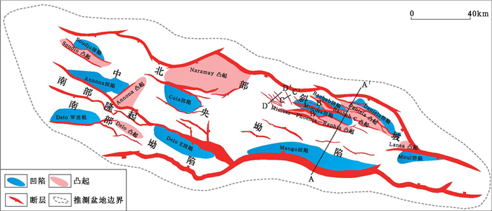 Bongor盆地平面上呈纺锤形, 整体呈南断北超的构造形态, 自北向南可以分成4个次一级构造单元:北部斜坡、中央坳陷、南部隆起、南部坳陷, 相邻构造单元间发育一些构造调节带(图 2)。盆内发育正断层, 北西—南东向主控断层控制了盆地的形成演化和沉积过程, 其次为北西西—南东东向断层和少量的北东—南西向调节断层(图 2)。