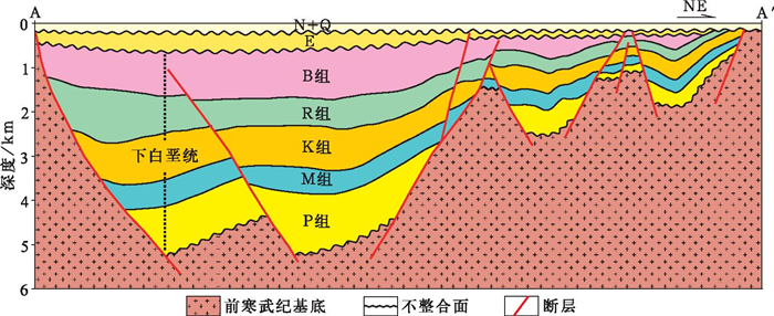 Bongor盆地自下而上发育3个构造层:最底层为盆地的古老基底, 钻井揭示岩性主要为前寒武纪花岗岩和花岗片麻岩; 中部构造层为盆地白垩纪—古近纪张裂过程中所充填的陆相碎屑岩地层, 岩性以砂岩和泥岩(页岩)薄互层为主, 该层是Bongor盆地最主要的沉积层, 厚度达数千米, 目前盆地内主要的油气发现均赋存于该构造层内; 顶面构造层为新近纪以来坳陷期沉积的地层, 厚度仅为200~500m, 与中部构造层以不整合面为界(图 3)。