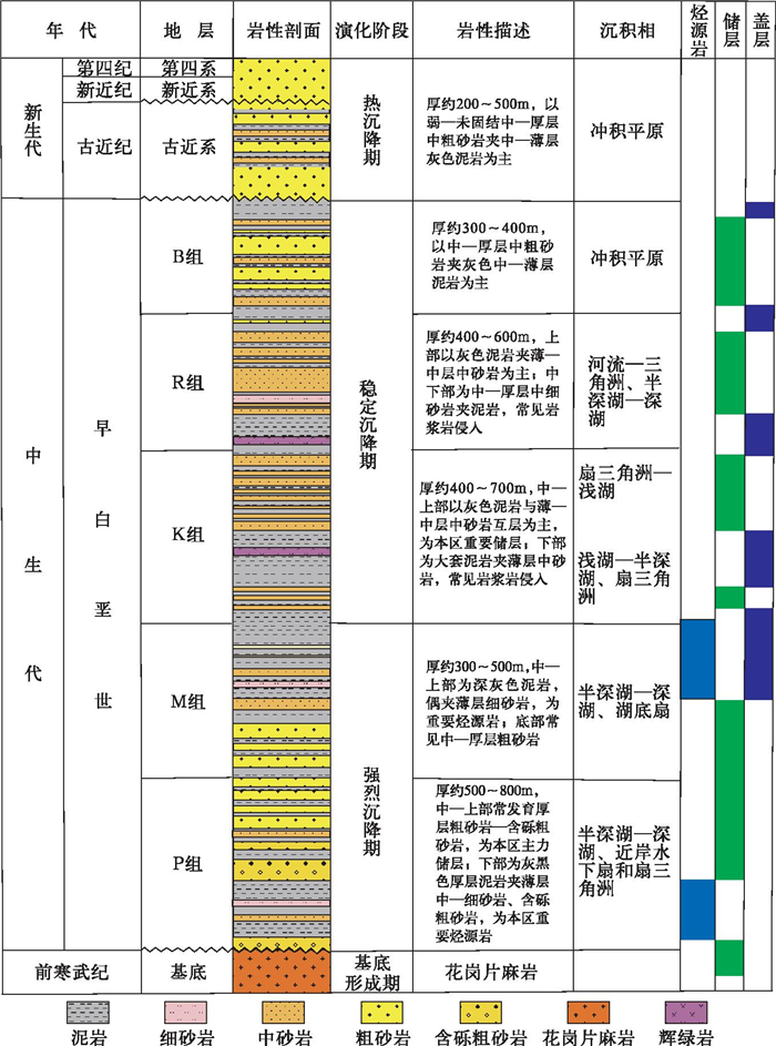 白垩纪早期大西洋自南而北开始张裂[34], 大西洋的张裂导致了南美板块和非洲板块的分离、中非剪切带的形成, 并引起了非洲板块内部裂谷活动的发生, 形成了中西非裂谷系盆地的雏形[35]。盆地初始裂陷期, Bongor盆地内水体较浅, 大部分早期隆起出露在外, 除中央坳陷外, 北部斜坡带各小洼陷由于隆起分隔互不连通, 这些出露的山头不断遭到风化剥蚀, 剥蚀的产物直接入湖, 快速堆积形成近岸水下扇—扇三角洲沉积(图 4), 这套沉积体是目前盆地内最重要的储层[29]。M组沉积时期, 盆地内水体加深, 除局部高隆起外, 大多数隆起没入水面以下, 盆内沉积了一套半深湖—深湖相泥岩, 厚度在数十米到数百米不等, 该套泥岩是盆地内最重要的烃源岩和盖层[29](图 4)。K组沉积时期盆地断陷活动减弱, 沉积速率降低, 同一层位在不同构造部位的厚度差异开始减小(图 4)。R组、B组沉积时期, 大量沉积物从盆地四周充填入盆地内, 水体逐步变浅, 各构造单元之间的高差进一步缩小, 断裂活动进一步减弱(图 4)。