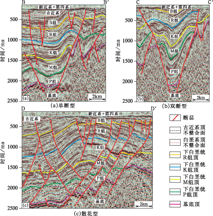 Bongor盆地的构造反转主要表现为地层的褶皱隆升, 目前盆地内未发现明显的逆断层, 反转构造以褶皱型为主, 形成反转背斜、断背斜和断鼻构造。根据反转构造的几何形态和与主控断层的关系, 将Bongor盆地的反转构造分成3种类型:单断型、双断型和散花型(图 5)。