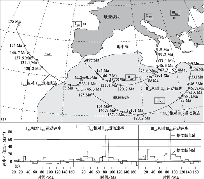 非洲板块内部3个点围绕欧亚板块内部3个固定点相对运动轨迹(a)和速率(b)示意图(据文献[16]、[46-47]修改)