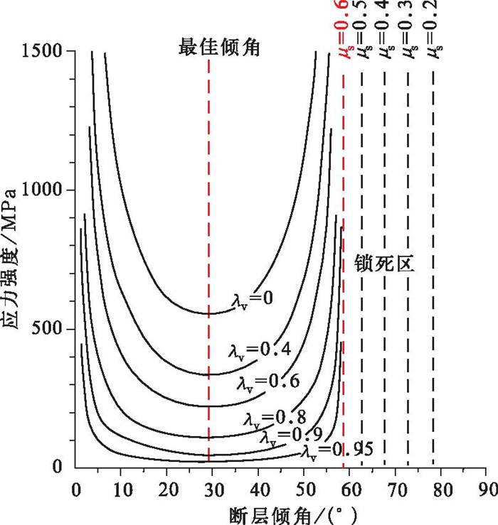 Bonini等对在不同断层倾角、断面摩擦因子(μs)和孔隙流体因子(λν)条件下, 断层反转所需的挤压应力强度进行了数值模拟[45]。模拟结果表明, 在相同断面摩擦因子(μs)和孔隙流体因子(λν)条件下, 断层倾角与发生反转所需应力强度关系曲线呈U形(图 7), 断层倾角过小或者太大, 断层反转所需的应力强度大, 不易反转, 而处于中间的某个倾角, 断层发生逆转所需应力强度最低(例如, 当μs=0.6时, 倾角为30°左右的断层反转所需应力强度最低, 图 7)。当断层倾角超过一定数值时, 断层进入锁死区, 不会发生反转(例如, 当μs=0.6时, 断层倾角接近60°就开始进入锁死区, 图 7)。