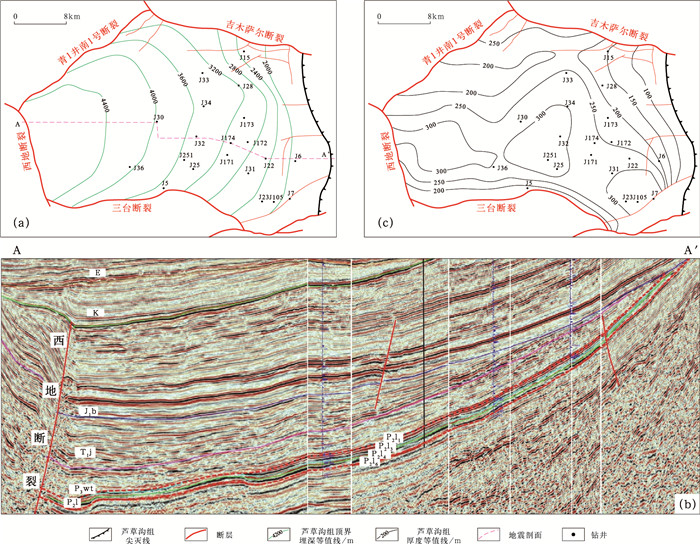 图 1 准噶尔盆地东部吉木萨尔凹陷芦草沟组地质概况图 (a)芦草沟组顶面埋深等值线图;(b)东西向过井地震剖面图;(c)芦草沟组厚度等值线图 |