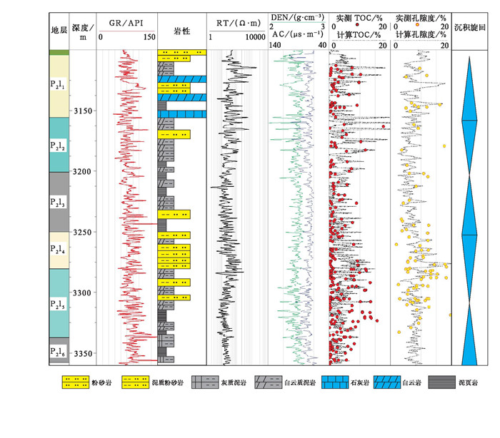 2 主要地质特征 2.1 沉积特征吉木萨尔凹陷芦草沟组形成于残留海封闭后的咸化湖盆沉积环境,为一套岩性较细的浅湖—深湖相沉积[14-18]。受构造、气候、沉积物供给等因素影响,芦草沟组沉积时期湖盆处于深水、浅水不断变换的环境,在吉木萨尔凹陷内形成广泛发育的泥晶白云岩、粉砂岩和混积岩。吉木萨尔凹陷芦草沟组与下伏井井子沟组及上覆梧桐沟组均呈不整合接触关系,湖盆北部地区遭受强烈剥蚀,上部地层剥蚀殆尽。整体上,随着陆源输入的周期变化,吉木萨尔凹陷二叠系芦草沟组具有2.5个三级旋回,进一步根据测井响应特征、有机质丰度与孔隙度,可以划分成6个地层单元(图 2)。
