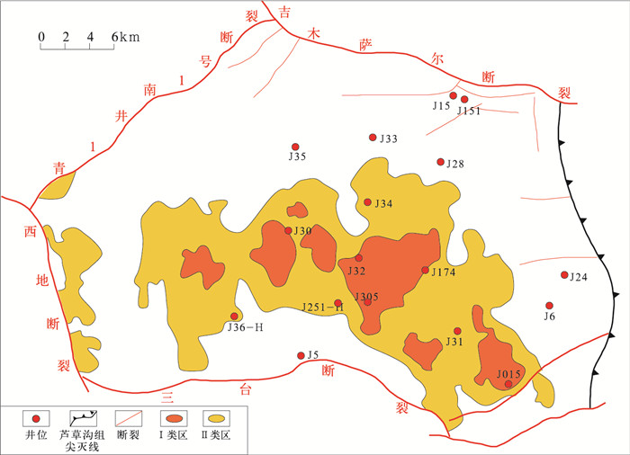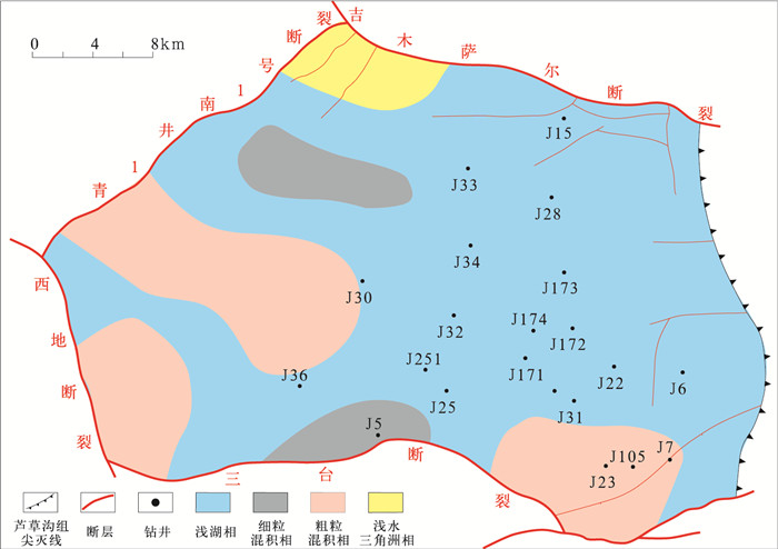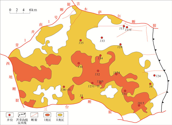 准噶尔盆地形成于海西期,早二叠世晚期,盆地南缘残存的博格达海槽开始闭合造山,形成博格达山前中二叠世早期的前陆型箕状坳陷,吉木萨尔凹陷与博格达山前凹陷、阜康凹陷水体相连,沉积了一套南厚北薄的火山—磨拉石建造。中二叠世晚期,吉木萨尔凹陷封闭,并作为一个相对独立的沉积单元接受芦草沟组(P2l)的湖泊相沉积,成为吉木萨尔凹陷的主力烃源岩层,地层厚度一般为100~300m(图 1c)。三叠纪末期的印支运动使吉木萨尔凹陷东部的古西凸起强烈上升,造成吉木萨尔凹陷东斜坡三叠系、二叠系遭受不同程度的剥蚀,侏罗系与下伏地层不整合接触。燕山期准噶尔盆地构造活动频繁,具有强烈的振荡性,燕山运动在吉木萨尔凹陷有3幕,活动都较强烈,是吉木萨尔凹陷及周边地区的主要改造期。侏罗纪末期的燕山运动Ⅱ幕使沙奇凸起快速强烈隆升,吉木萨尔断裂强烈活动,凹陷内侏罗系遭受严重剥蚀。至白垩纪时独立的凹陷格局消失,受燕山运动Ⅲ幕的影响,吉木萨尔凹陷东南部逐渐抬升,白垩系遭受不同程度的剥蚀。新近纪—第四纪的喜马拉雅期,南北向强大挤压应力使北天山快速、大幅度隆升,并向盆地腹部冲断,阜康断裂带下盘发育类似于前陆盆地前渊的冲断型箕状凹陷,而东部的古西凸起隆升缓慢,吉木萨尔凹陷自南向北新近系和第四系整体呈楔状,地层向东逐渐减薄。
