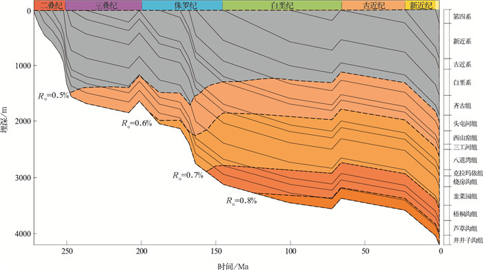 图 4 吉木萨尔凹陷二叠系芦草沟组埋藏史、热演化史图 |