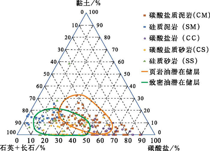 吉木萨尔凹陷东斜坡区二叠系芦草沟组储层普遍致密,局部发育溶孔型与裂缝型两类较好储层,储集物性与岩性及溶蚀、裂缝发育程度有关。利用岩心、岩石薄片、常规测井、成像测井和核磁共振测井资料,对吉木萨尔凹陷二叠系芦草沟组岩性进行识别和定名,建立岩性识别图版。芦草沟组主要发育5种岩石类型:碳酸盐质泥岩、硅质泥岩、碳酸盐岩、碳酸盐质砂岩、硅质砂岩(图 5)。其中碳酸盐质泥岩包括白云质泥岩和灰质泥岩,都以纹层结构为主要特征,有机碳含量较高;碳酸盐岩包括白云岩和石灰岩,石灰岩较少,白云岩通常为块状构造;碳酸盐质砂岩包括白云质砂岩和灰质砂岩,灰质砂岩较少,白云质砂岩主要为块状构造,物性较好;硅质泥岩和硅质砂岩都以块状构造为主。从矿物三角图可以看出,5种岩石类型的黏土矿物含量都较低。硅质砂岩和碳酸盐质砂岩的长石和石英含量较高,是有利的致密油潜在储层;碳酸盐质泥岩的碳酸盐矿物和黏土矿物含量相对较高,且有机质丰富,是有利的页岩油潜在储层。