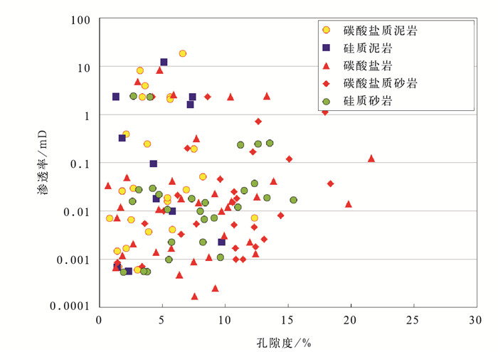 吉木萨尔凹陷芦草沟组5种主要岩石类型纵向上交错分布,物性较差,孔隙度介于2%~22%,主体小于10%,空气渗透率介于0.0001~20mD(图 6)。碳酸盐质泥岩孔隙度介于1.5%~12.6%,主体小于8%,空气渗透率主体小于0.1mD,主要发育黏土矿物粒内孔,连通孔喉直径主体介于7~100nm。硅质泥岩孔隙度介于1.4%~10.0%,主体小于8%,空气渗透率主体小于0.1mD,主要发育黏土矿物粒内孔,连通孔喉直径主体介于7~75nm。碳酸盐岩孔隙度介于1.3%~22.3%,主体小于15%,空气渗透率主体小于0.1mD,粒间孔、粒内溶蚀孔较发育,连通孔喉直径主体介于25~140nm。碳酸盐质砂岩孔隙度介于1.4%~18.4%,主体小于15%,空气渗透率主体小于0.1mD,粒间孔、粒内溶蚀孔较发育,连通孔喉直径主体介于18~650nm。硅质砂岩孔隙度介于1.9%~17.0%,主体小于15%,空气渗透率主体小于0.1mD,粒间孔、粒内原生孔较发育,连通孔喉直径主体介于178~2900nm。总体看,有利储层排序为碳酸盐质砂岩、硅质砂岩、碳酸盐岩、碳酸盐质泥岩、硅质泥岩。