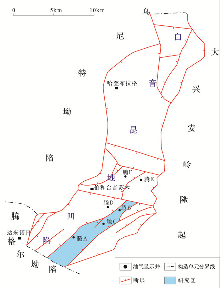 1 区域地质背景白音昆地凹陷地处内蒙古赤峰市克什克腾旗地区,构造上位于二连盆地东部,南与腾格尔坳陷相邻,西北与乌尼特坳陷相邻,凹陷东西两侧发育两条控凹断层,北东向展布,南北长约50km,东西宽约6~10km,面积为500km2,整个凹陷呈东缓西陡的箕状断陷结构特点。白音昆地凹陷早白垩世为断陷湖盆沉积,烃源岩主要发育于下白垩统,储层以砂岩和凝灰质砂岩为主,盖层为下白垩统上部的泥岩层。下白垩统自下而上发育义县组、九佛堂组、沙海组和阜新组,其烃源岩在该4套地层内均有分布[18-20]。研究区腾2块则位于白音昆地凹陷南部(图 1),是前期勘探预测出的油气有利富集相带。