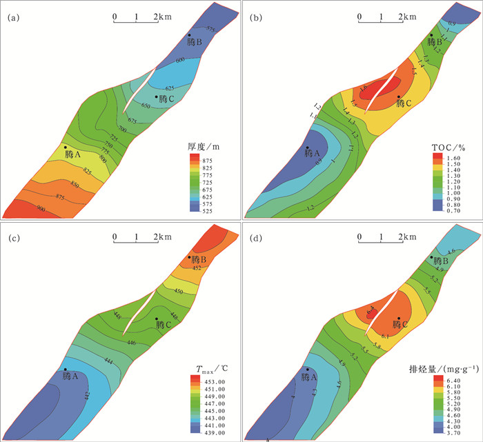 早白垩世是白音昆地凹陷深陷期,腾2块烃源岩主要分布于半深湖—深湖相带中[2-3],在滨浅湖和扇三角洲前缘等相带内也有一定展布,岩性主要为深灰色、灰黑色泥页岩。受白垩纪同生断层控制,烃源岩厚度变化较大,依据陆相烃源岩有机碳含量TOC > 0.5%的丰度下限标准,腾B井烃源岩单层厚度为5~106m,单层平均厚度为16m,累计平均厚度在580m以上。在单井烃源岩厚度分析的基础上,结合地震反演技术对烃源岩厚度的平面变化特征进行预测,结果表明研究区内自北向南,烃源岩厚度逐渐增大(图 2a),这与南部地区近物源的沉积特征相一致。层位上,烃源岩主要集中分布在下白垩统沙海组和九佛堂组,其中沙海组烃源岩平均厚度为300.2m,九佛堂组烃源岩平均厚度为279.5m(表 1)。义县组烃源岩主要分布在北部腾B井附近,中部和南部不发育;九佛堂组烃源岩由南向北厚度逐渐减少;沙海组烃源岩中部和北部相对较发育,南部稍差;阜新组烃源岩南部厚度最大,中部和北部受古近纪—-新近纪构造运动影响,地层遭受了大量剥蚀,烃源岩厚度减薄。