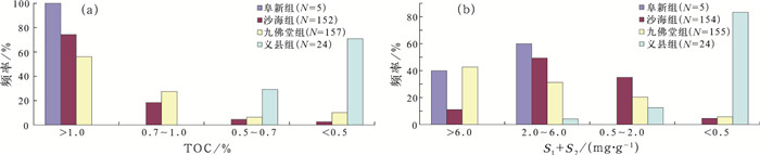 从TOC的统计分析来看,沙海组和九佛堂组以好烃源岩为主,TOC平均值分别达到1.33%和1.16%,其中TOC > 1%的样品出现频率分别占74.34%和56.05%(图 3a)。阜新组样品偏少,但现有分析显示其烃源岩也达到了中等偏好的程度,义县组烃源岩的TOC特征表明其烃源岩有机质丰度很差。而生烃潜量(S1+S2)的分析结果表明,沙海组和九佛堂组烃源岩生烃潜量平均值分别达到3.14 mg/g和5.90mg/g,以中等烃源岩为主,其中沙海组烃源岩S1+S2在2~6mg/g的样品出现频率为49.35%,而九佛堂组烃源岩S1+S2 > 6mg/g出现的频率为42.68%(图 3b)。
