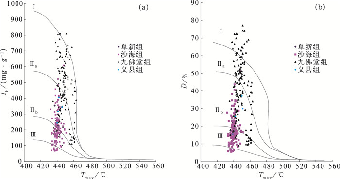 分析结果表明,九佛堂组氢指数最高,139个样品点的氢指数一般分布在101.33~808.67mg/g,平均为439.2mg/g,其中氢指数在350~700mg/g范围内的样品点占58.27%;沙海组氢指数较低,145个样品点的氢指数一般分布在65.81~608mg/g,平均为219.17mg/g,其中氢指数在350~600mg/g范围内的样品点占58.27%;从Tmax—IH关系图(图 4a)可看出,九佛堂组烃源岩以Ⅱa—Ⅱb型为主,沙海组烃源岩以Ⅱb—Ⅲ型为主。九佛堂组烃降解率最高,139个样品点的烃降解率一般分布在9.07%~77.14%,平均为40.44%,其中烃降解率在30%~70%范围内的样品点占63.31%;沙海组烃降解率较低,145个样品点的烃降解率一般分布在5.52%~51.27%,平均为18.59%,其中烃降解率在10%~30%范围内的样品点占80%;从Tmax—D关系图(图 4b)可看出,九佛堂组烃源岩部分样品为Ⅰ型,但以Ⅱa—Ⅱb型为主,沙海组烃源岩以Ⅱb—Ⅲ型为主。