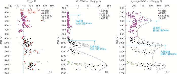 生烃门限是指有机母质演化过程中开始大量向油气转化的临界地质条件。随着埋深的增加,干酪根逐渐成熟裂解为可溶有机质,其间Tmax、S1/TOC随埋深均有明显的增加,其突变的深度节点可以确定烃源岩的生烃门限[17]。图 5b中沙海组S1/TOC数据点在350m左右出现了较为明显的数值增大,表明此深度范围油气开始大量生成,但值得注意的是,沙海组中下部的烃源岩成烃条件变差,未有大量油气生成,最为直接的证据就是该层段处样品点Tmax值明显小于440℃及Ro<0.5%的成熟门限,烃源岩处于未成熟状态。九佛堂组烃源岩的生烃门限在950m左右(图 5b),但生烃特征具有周期旋回的特点,具体来说,九佛堂组烃源岩在埋深950m左右发育的第一套烃源岩进入生烃门限,大量生烃,而1150m埋深处的第二套烃源岩上部未能表现出很好的生烃特征,在埋深1200m处,烃源岩Tmax及Ro明显处于成熟阶段(图 5a),其再次进入生烃门限,1500m以下的烃源岩总体上处于成熟阶段下的生烃状态。