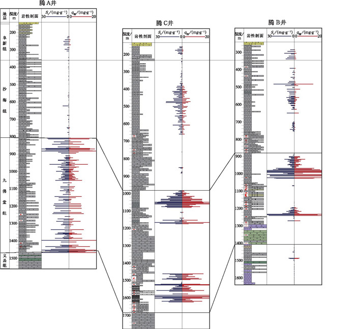(3)根据腾2块烃源岩的S1/TOC、(S1+S2)/TOC、St与q排等参数特征,认为九佛堂组烃源岩生、排烃门限分别为950m和1050m,沙海组烃源岩生、排烃门限分别为350m和500m;九佛堂组烃源岩St为13.26mg/g,q生为8.10mg/g,q排为7.68mg/g,其生油潜力要远好于沙海组烃源岩的生油潜力。区域上,由南向北,腾2块烃源岩生排烃能力逐渐变强,储层油气显示变好,鉴于腾2块储层物性及源储匹配关系,建议在区块中部和北部的九佛堂组优选厚度大、生排烃效率高的烃源岩发育带,进行有利开发区带的评价。