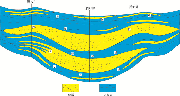 腾2块南部的烃源岩(以近区块边部的腾A井为例)单层厚度不大,特别是沙海组,较差的原始生排烃能力是导致周边砂岩储层未见良好油气显示的重要因素(图 6)。区块中部至北部,优质烃源岩的单层厚度变大,有机质成熟度增大,原始生排烃量增大,油气转化效率提高,形成了较好的油气分布。腾2块储层发育扇三角洲前缘相砂体,具有中孔低渗储集特征,同时结合源储匹配关系(图 7),油气近源成藏,有效烃源岩分布是油气成藏的首要条件,因此认为在区块中部和北部的九佛堂组内,以厚度大、高效生排烃的优质烃源岩发育带为根本条件[32],进行有利开发区带的优选,是提高下一步开发成功率的重要思路。