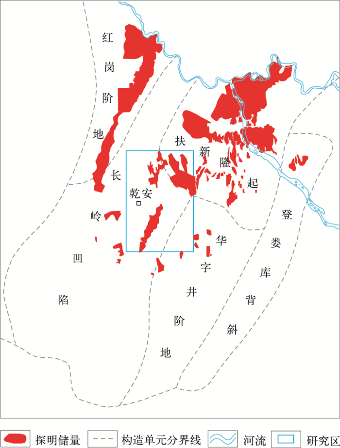 1 乾安致密油典型地质特征国内外致密油多为湖相或海相沉积,储层分布稳定,成藏模式多为自生自储,含油饱和度普遍较高,大多存在无水采油期,如美国的巴肯致密油、鄂尔多斯盆地的延长组致密油、准噶尔盆地的玛湖致密油和吉木萨尔致密油等[1-6, 12-16]。松辽盆地南部扶余致密油主要分布在长岭凹陷向扶新隆起、华字井阶地过渡的乾安地区(图 1),与国内外致密油相比,品质较差,表现为以下3个典型特征: