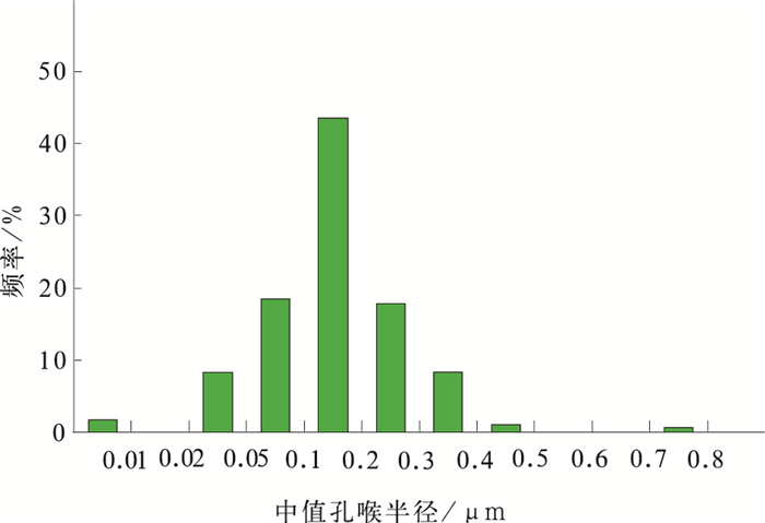 图 3 孔喉半径分布直方图 Fig. 3 Pore throat radius distribution |