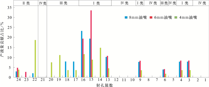 以测井七性解释为基础,结合微观化验、渗流特征及油气显示等信息,对储层进行综合评价,划分为Ⅰ—Ⅳ类储层。地质工程一体化选取脆性指数高、尤其是可动流体含量及含油饱和度高的层段,按照甜点压裂的理念,改造好油层段,增大改造体积,实现蓄能提压和渗吸置换,其中:Ⅰ类储层实施密切割,设计3~5簇/段,簇间距为15m;Ⅱ类储层造长缝来沟通附近的好油层,设计2~3簇/段,簇间距为20m;Ⅲ—Ⅳ类储层不改造。从光纤产液剖面监测结果来看,在初期自喷阶段,Ⅰ类储层是主要的产能贡献层段。如乾268井在井口压力2MPa时应用连续油管下入光纤进行产液剖面监测,该井设计压裂24簇,其中9簇不出液(图 5),约30%的层段(Ⅲ—Ⅳ类储层)对产液量没有贡献。