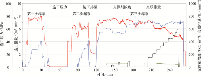 图 4 玛湖水平井滑溜水+瓜尔胶复合压裂施工曲线图 Fig. 4 Composite fracturing construction curve of horizontal-well slick-water + guar fracturing in the Mahu oilfield |