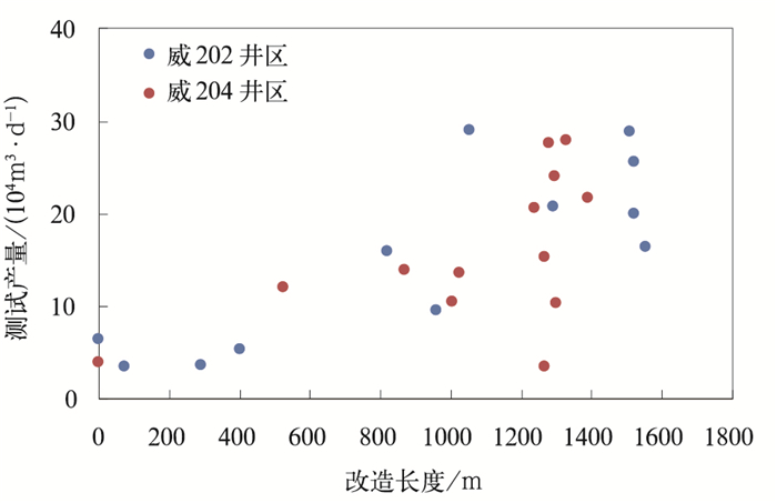 图 8 威远区块生产井测试产量与龙一1a小层改造长度关系 Fig. 8 Relationship between daily production and fractured length of Long1-1a in Weiyuan block |