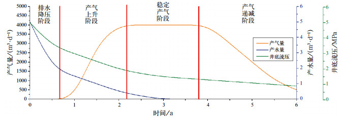 1 煤层气井的排采特征由于煤层气藏开发过程中的特殊性,需要充分考虑天然气的解吸附及产水情况,煤层气井的生产过程可划分为排水降压、产气上升、稳定产气和产量递减4个阶段,每个阶段具有不同的排采特征(图 1)。①排水降压阶段:投产初期的纯产水阶段,维持的时间较短(0.5~1.5年),产水量较大且波动剧烈,动液面和井底流压则波动下降。②产气上升阶段:气井周围地层压力降至解吸压力,开始产气并且气量波动剧烈,产水量一般先增大后下降,动液面和井底流压下降速度变缓,阶段末产气量和产水量均逐渐趋于平稳。③稳定产气阶段:产气量趋于平稳,产水量很小甚至不产水,动液面和井底流压基本保持平稳或有缓慢的下降,若此阶段的压降范围和解吸面积较大,则可保持较长时间的高产稳产。④产气递减阶段:产气量呈多周期性缓慢衰减,基本不产水,动液面和井底流压缓慢下降,压降范围和解吸面积基本不再扩大,气源逐渐衰竭。